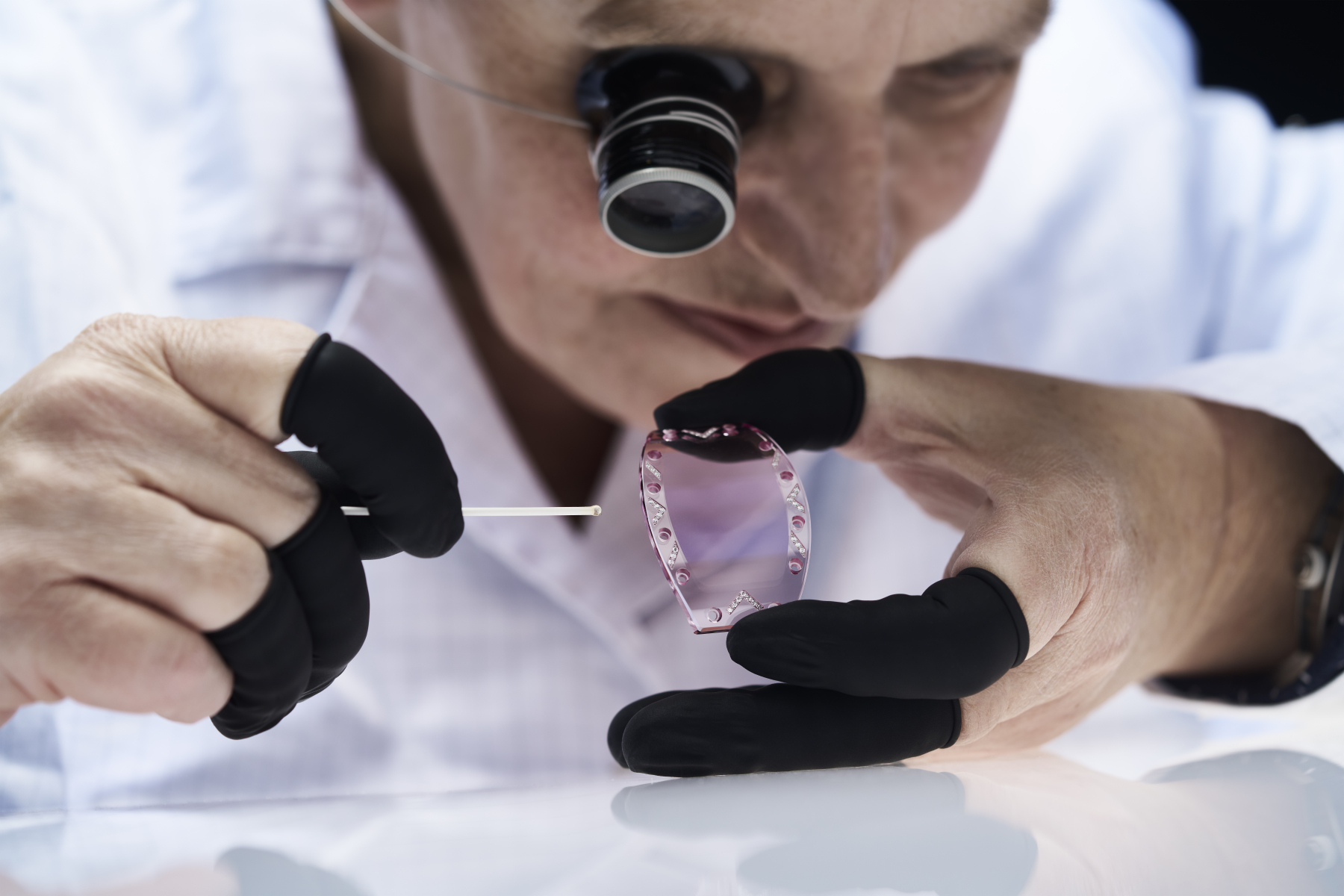 蓝宝石水晶通常用于表镜制作,而RICHARD MILLE将整块蓝宝石水晶切割制成表圈、中层表壳甚至表底盖,率先实现了蓝宝石水晶表壳的全件切削工艺,当属业界首例。
