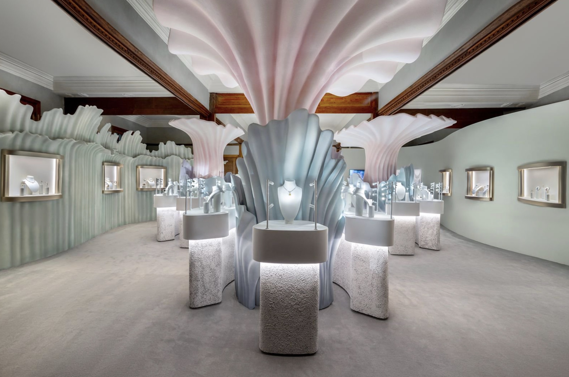 受该系列主题启发,2025 Blue Book高级珠宝系列 Sea of Wonder 瑰海奇珍作品悉数陈列于深蓝色调与波纹图案交织的空间之中。