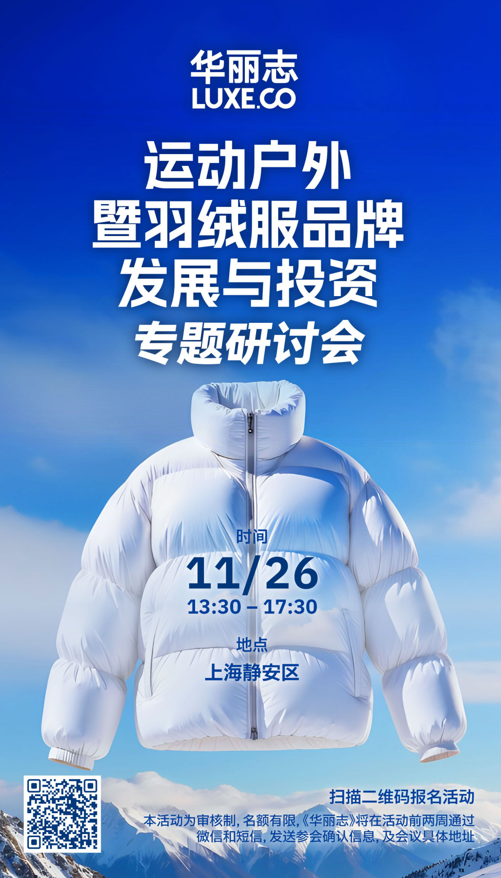 2025年11月26日(周三),华丽志将在上海举办专题研讨会,解读运动户外暨羽绒服品牌发展与投资的最新趋势。