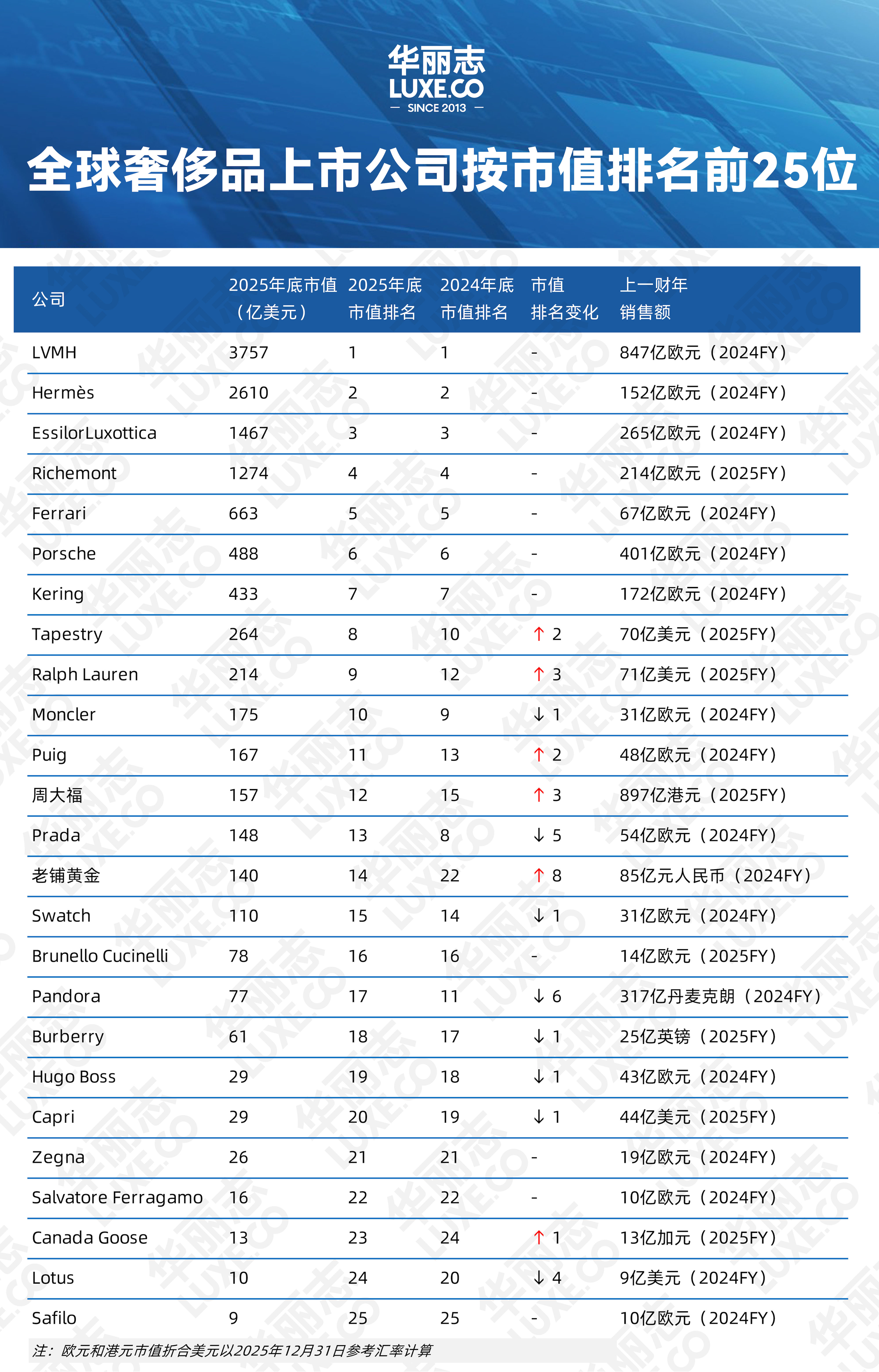 从市值规模来看,排名前七大的头部奢侈品上市公司的位次和去年一样,路易威登、迪奥、宝格丽、蒂芙尼等品牌的母公司、法国奢侈品巨头 LVMH集团蝉联第一 (尽管2025年曾一度被法国同行爱马仕超越),爱马仕排名第二,奢侈眼镜巨头依视路陆逊梯卡第三,高级珠宝和腕表巨头、瑞士历峰集团第四,两大豪华汽车企业——法拉利和保时捷分列第五和第六,古驰、圣罗兰等品牌的母公司、法国奢侈品集团开云排名第七。