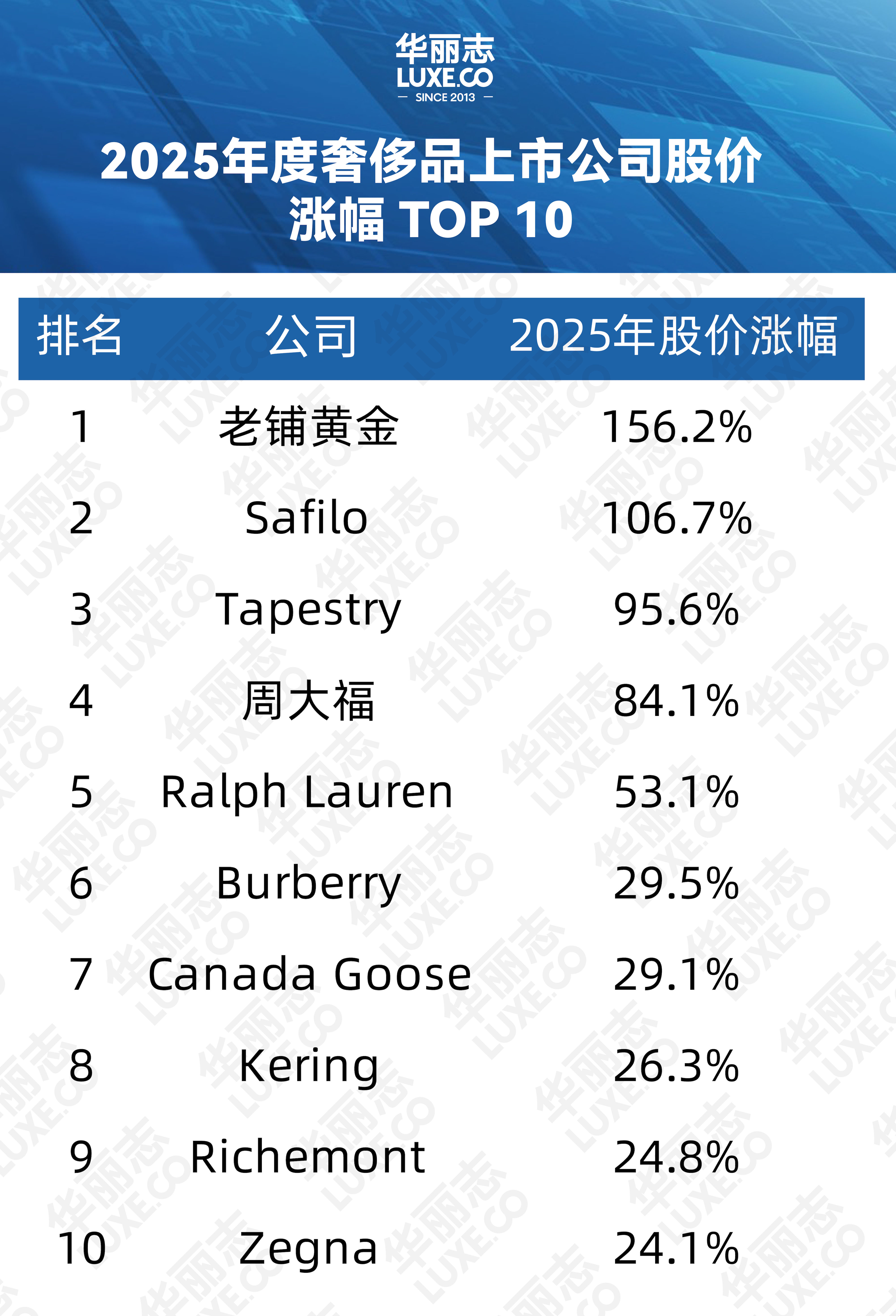 2025年度奢侈品上市公司股价涨幅 TOP 10