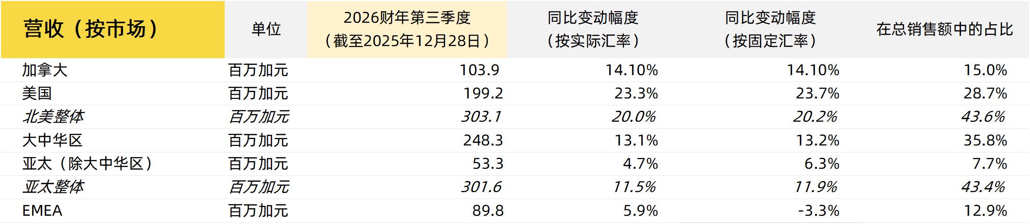就地区来看,大中华区营收同比增长13.1%至2.483亿加元(按固定汇率计增长13.2%),推动亚太市场营收同比劲增11.5%至3.016亿加元。北美市场表现同样强劲,营收同比增长20%。