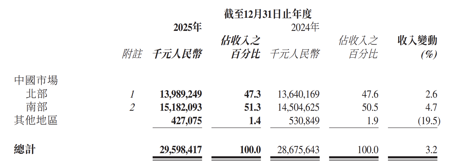 - 中国市场:北部地区营收同比增长2.6%至139.89亿元;南部地区营收同比增长4.7%至151.82亿元。