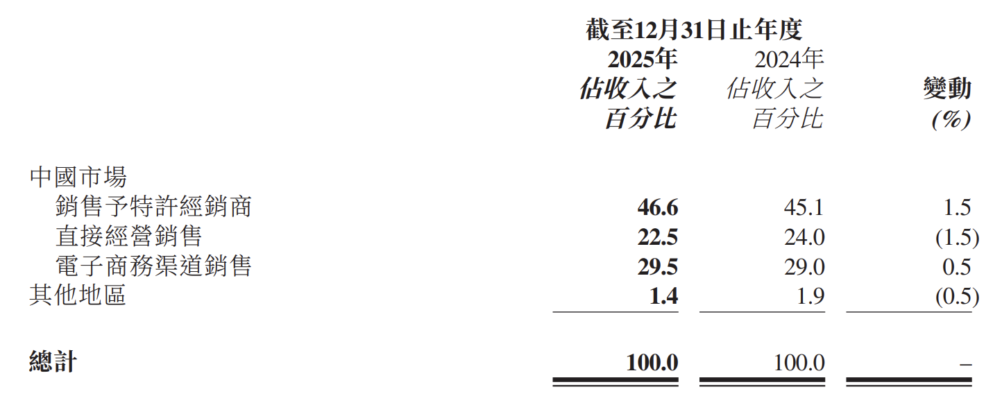 - 经销(销售予特许经销商):营收稳步增长,同比增长3%至137.73亿元,占比进一步提升至46.6%。