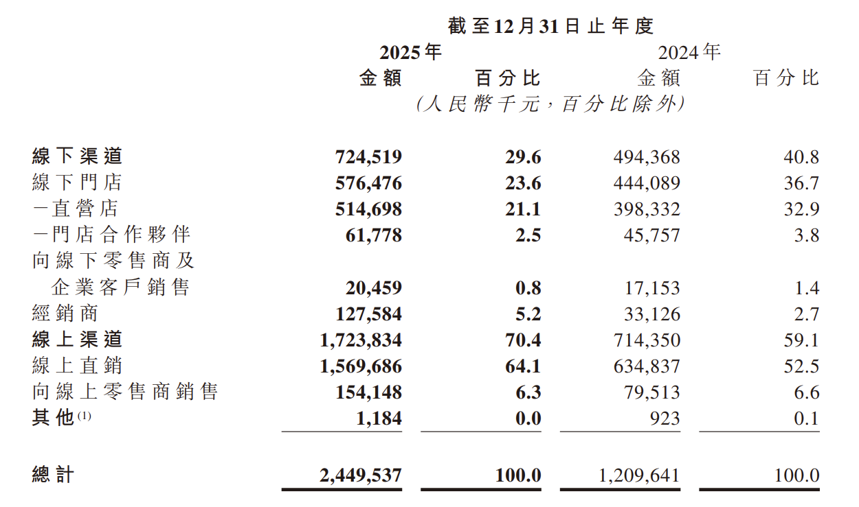 线上渠道总营收达到17.24亿元,占总营收的70.4%,较2024年的7.14亿元大幅增长。