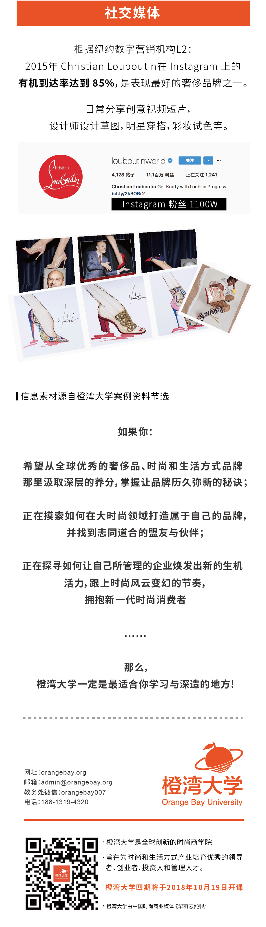 案例教学是橙湾教育(官网:orangebay.org)的核心。橙湾教研团队从2017年初起进行时尚商业案例的自主研发,形成了独树一帜的选题角度和严谨的研究方法。橙湾案例聚焦奢侈品、时尚和生活方式领域在当下最具代表性和参考价值的优秀品牌,以管理学知识点为框架梳理信息,通过案例透视与思考行业深层的现实问题,每个案例都经过至少40小时的时间开发成型。