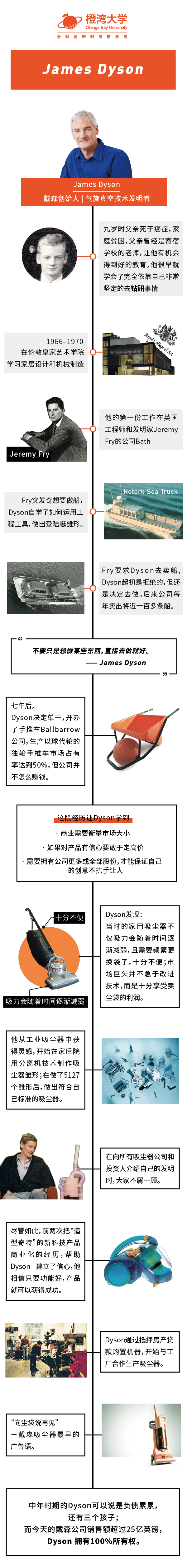 专长:Dyson是一个工业设计师和发明家,即便是在今天,他也更愿意介绍自己为“气旋真空技术发明者”而非戴森品牌创始人,而创新技术也正是戴森品牌最强大的品牌基因;在创立戴森之前,Dyson本人设计了好几个“造型独特”的产品,逐渐为市场接受,这些过去的经验让他能在面对拒绝时依旧充满信心;他也从过去的经历中吸收了很多商业智慧。