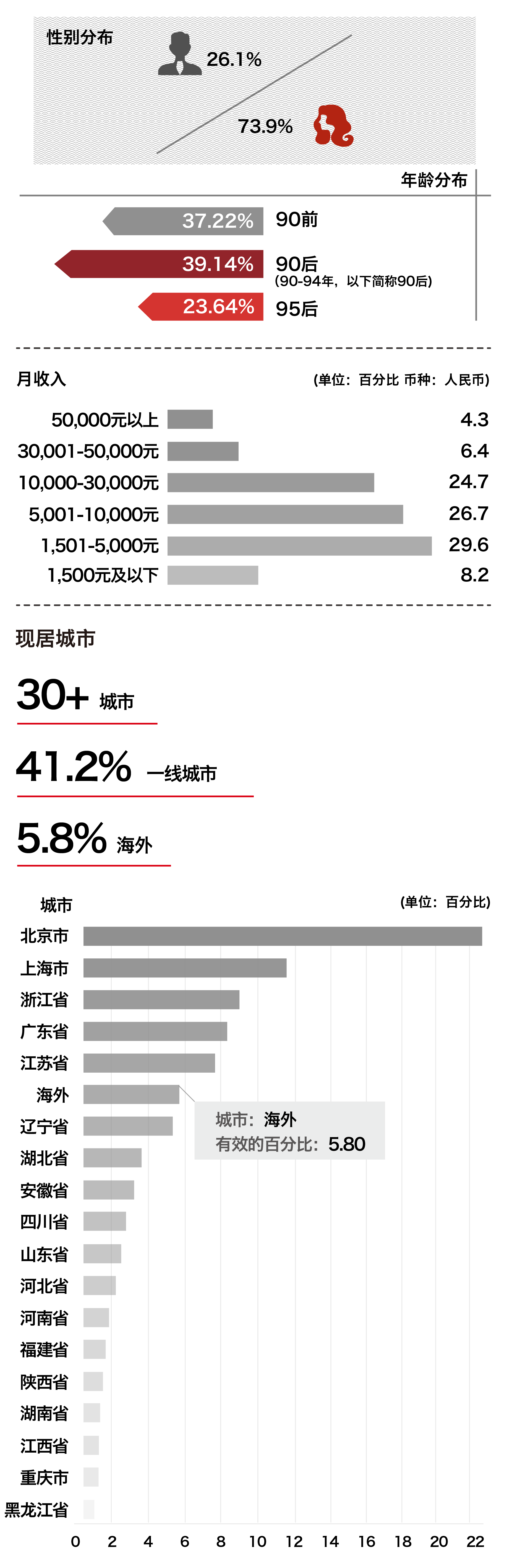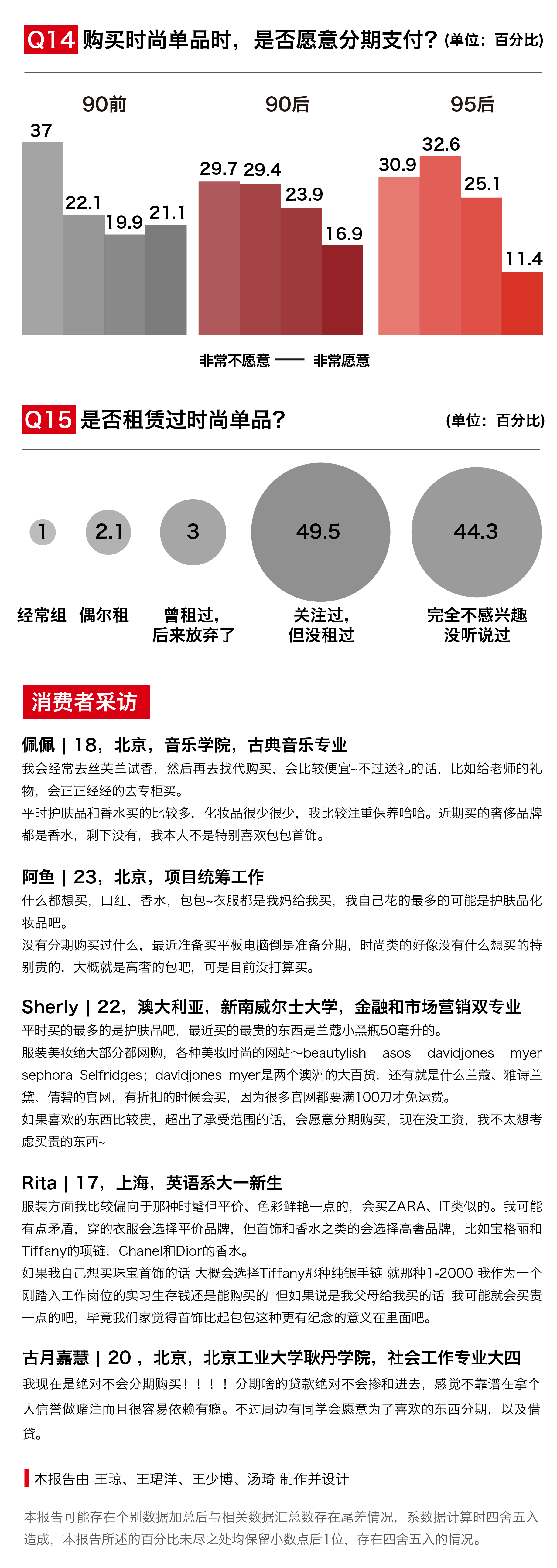 本次“2018 年度-中国新生代时尚消费调查问卷”白皮书收集了近3000份有效问卷,90前、90-95年、95后分别占比:37.22%;39.14%;23.64%。
