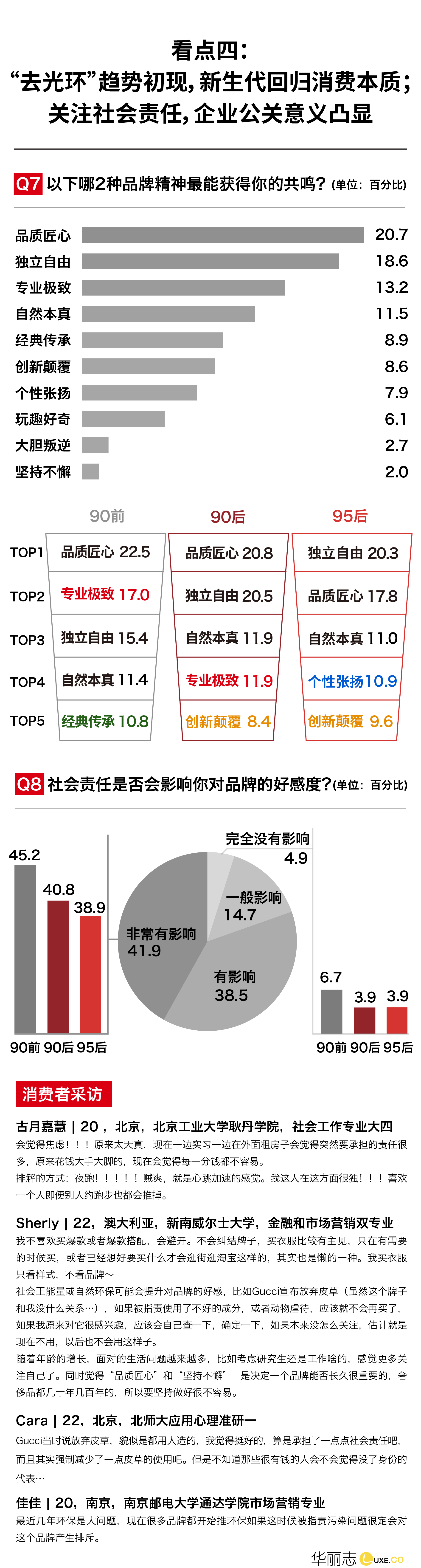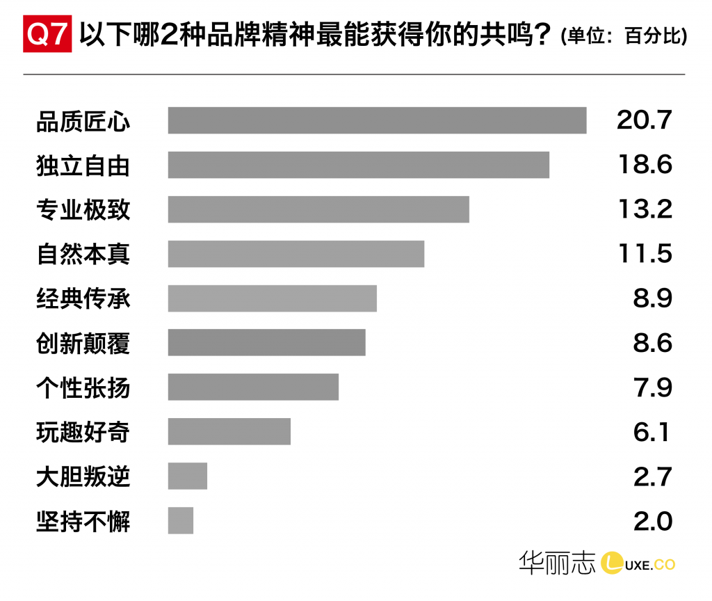 品质匠心、独立自由是本次调查问卷所有年龄段都产生强烈共鸣的品牌精神!