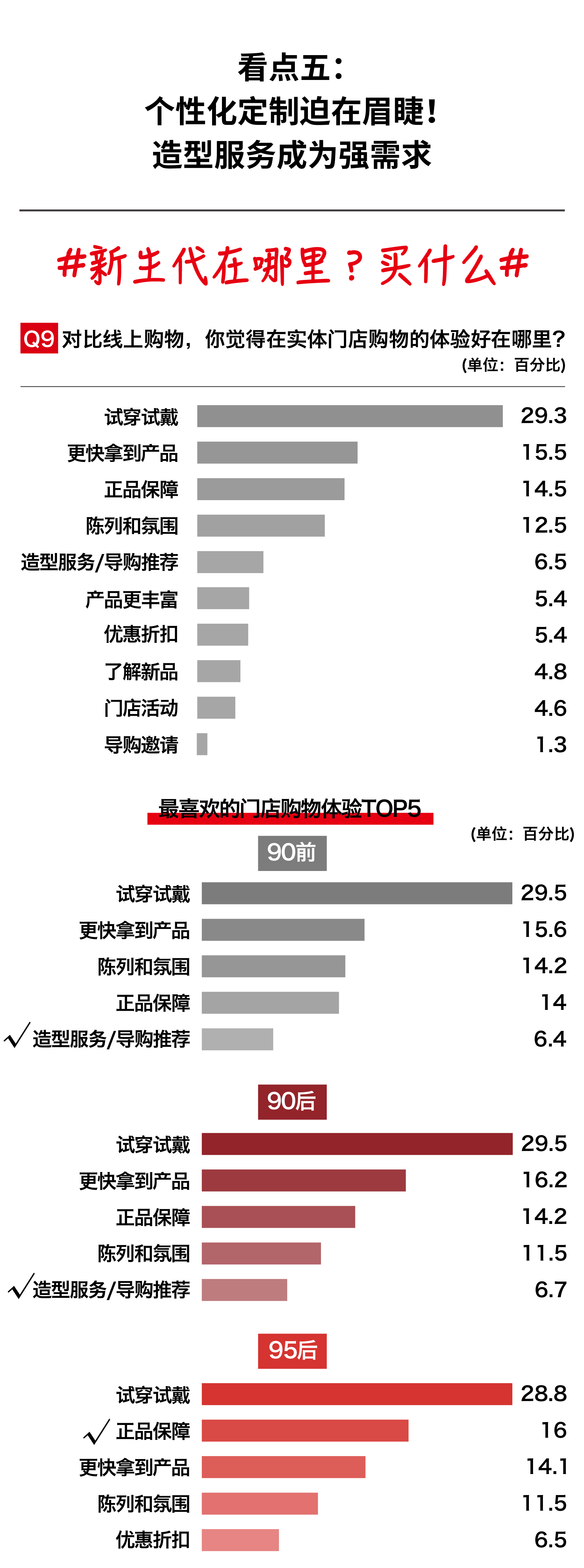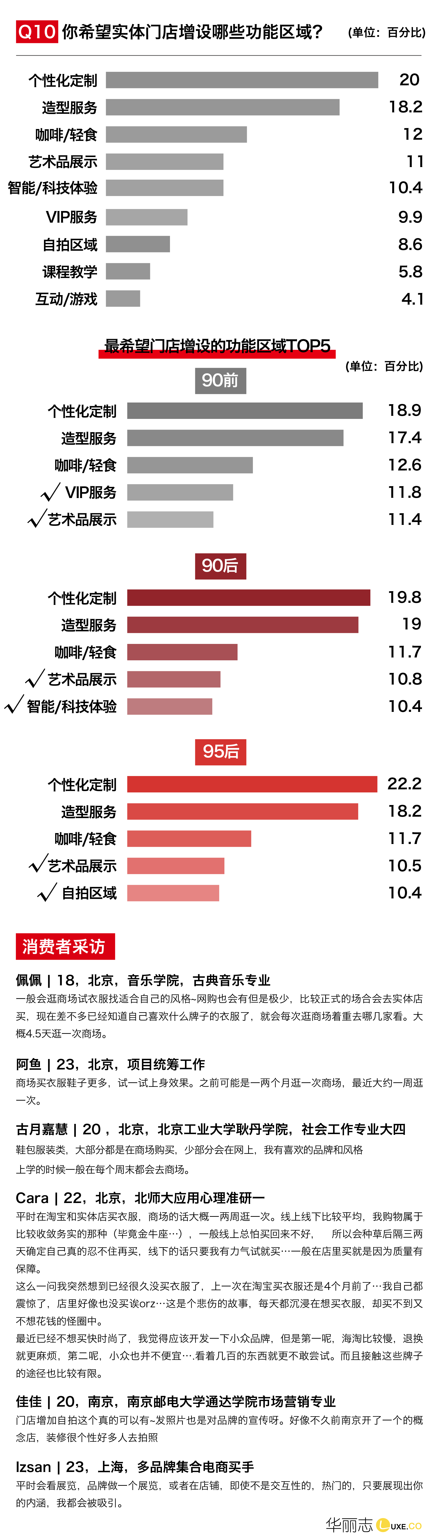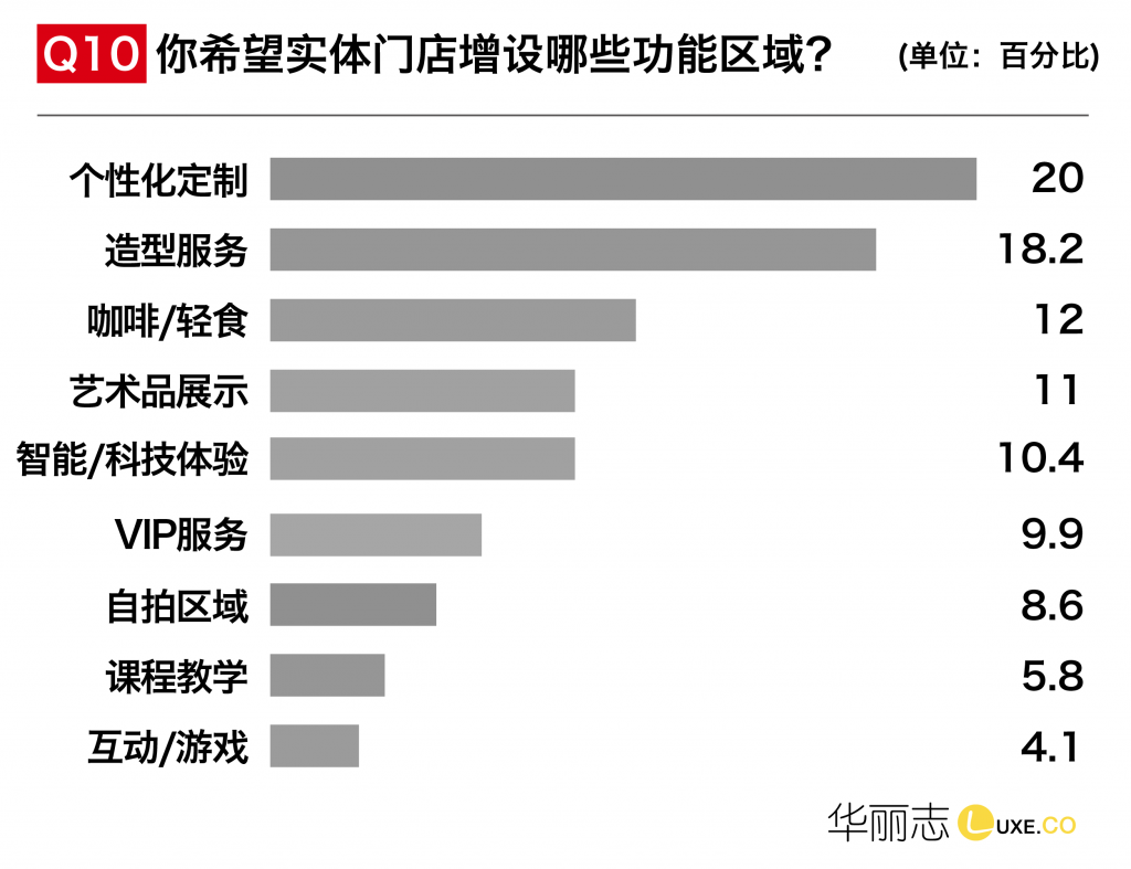 中国线上零售的发展已经相当成熟,线上和线下零售的融合大势所趋。本次问卷我们更多聚焦于处在动荡变革中的实体零售,调研结果显示:个性化定制和造型服务,已经成为年轻消费者的最强需求!