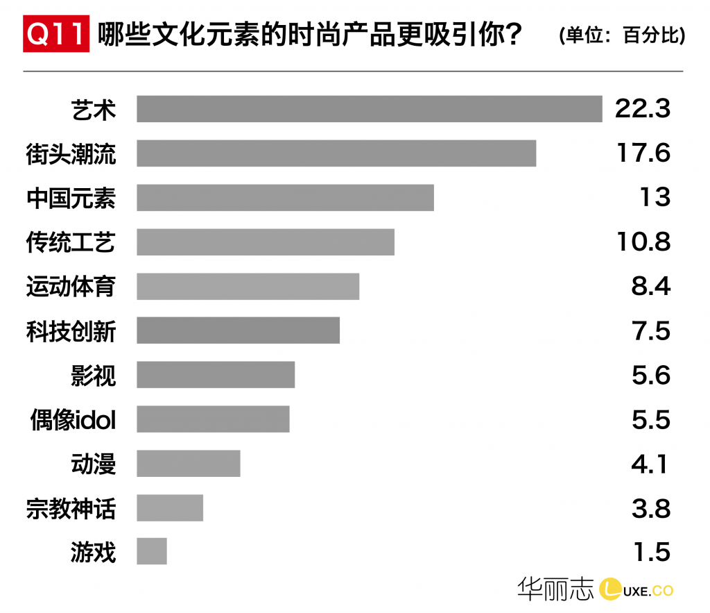中国新生代消费者的全球化属性越来越强,当supreme、off-white等潮牌火遍欧美,“街头潮流”也成为所有年龄段中仅次于艺术,最受各个年龄段喜爱的文化元素,紧随其后的是“中国文化”。