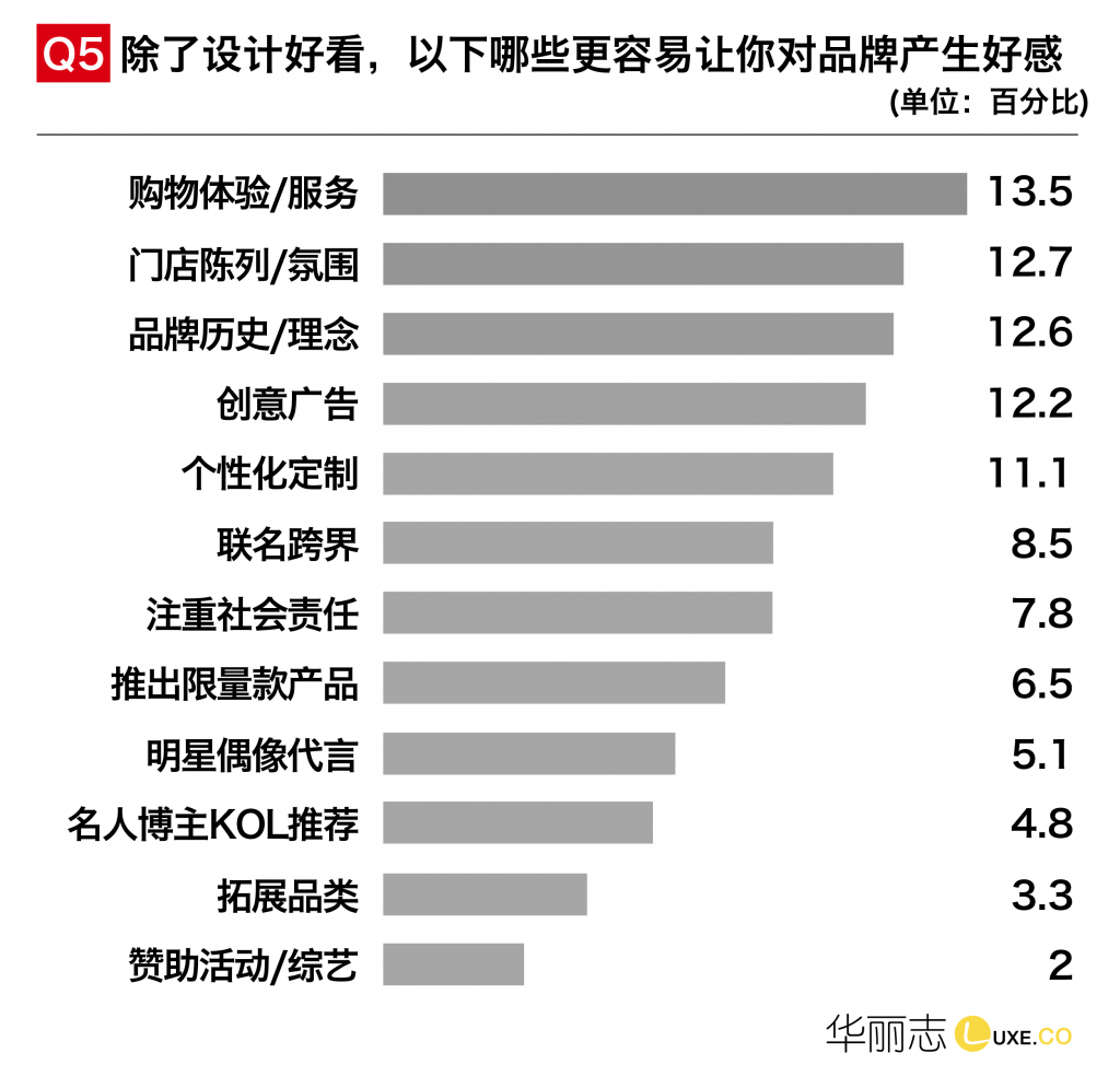 针对品牌好感度的产生,我们通过时尚品牌最关注的几个维度展开调研: