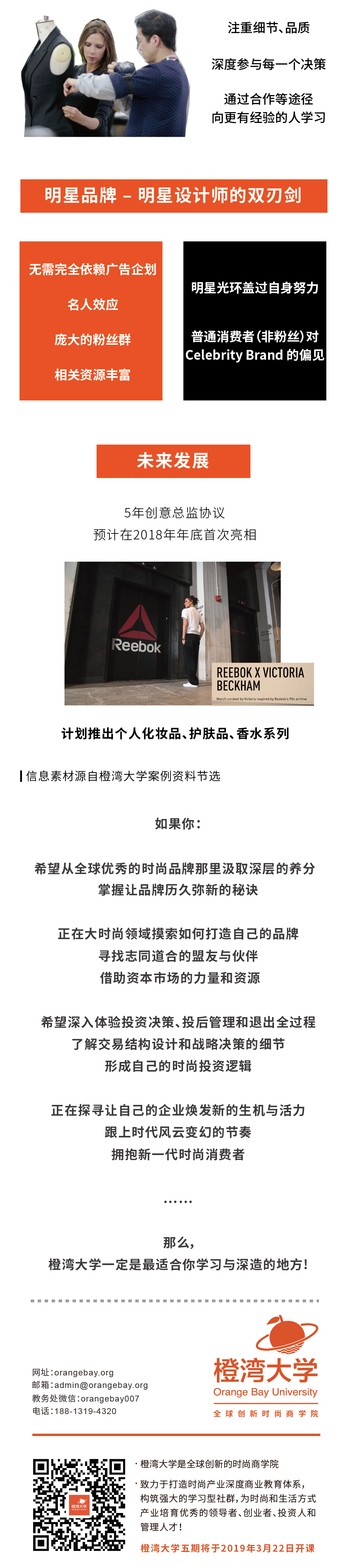那么,贝嫂又是如何成功转型为时尚企业家,把自己的品牌做得风生水起的?我们从橙湾教育(官网:orangebay.org)的教学案例库中选取精华内容,以信息图的形式呈现 Victoria Beckham 品牌的来龙去脉。