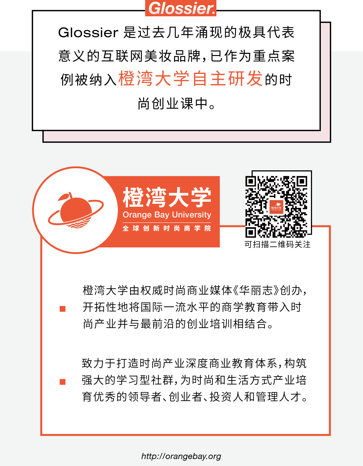 基于对全球新锐品牌的长期追踪和深入研究,橙湾教育(orangebay.org)的原创案例希望系统地分析其中最具代表性的品牌的成功经验,给有志于打造/投资新一代时尚和生活方式品牌的创业者和投资人提供最好的精神食粮。以下橙湾教育的精品案例图解,将带你深入了解 Glossier 的发展历程。
